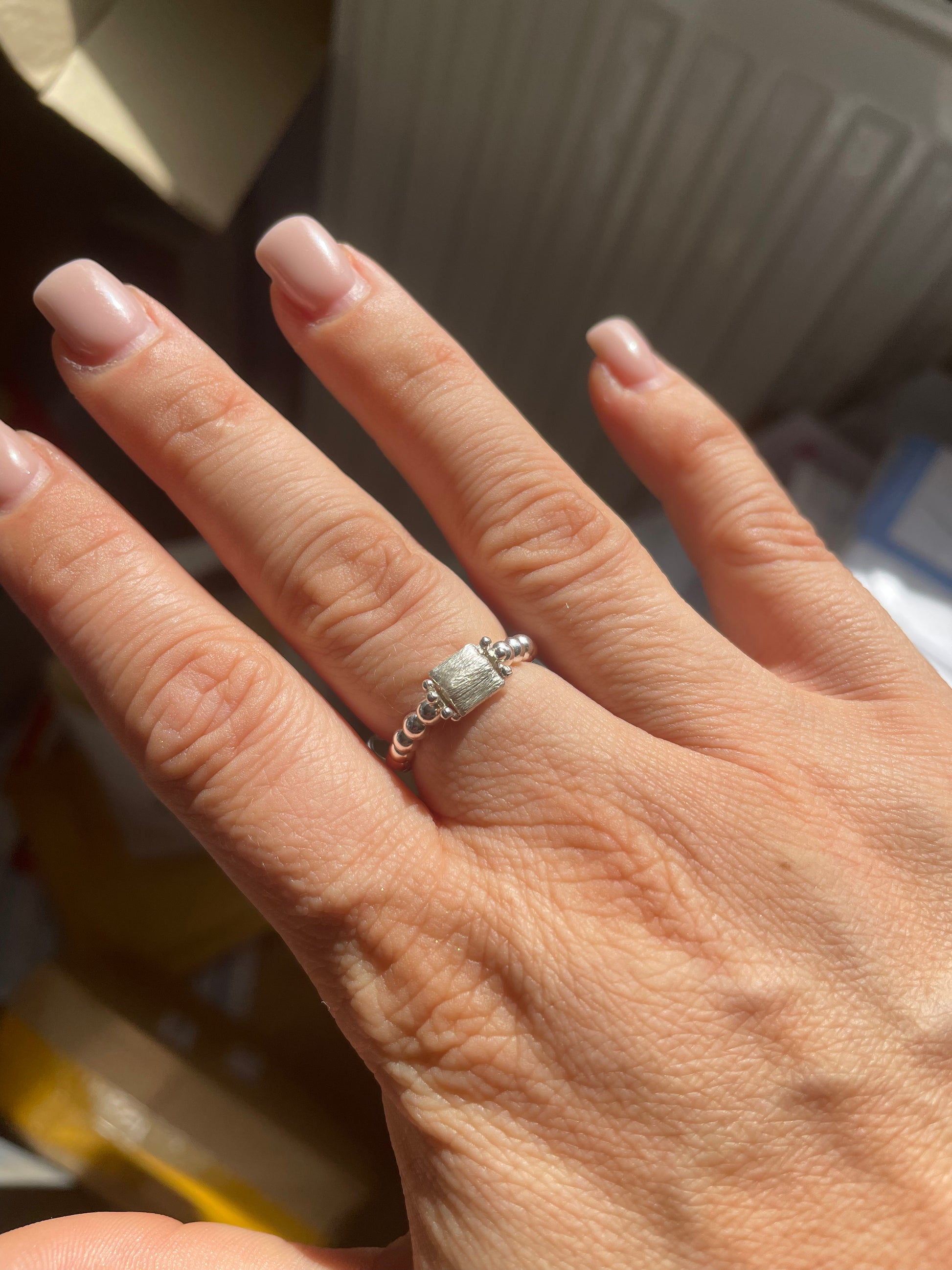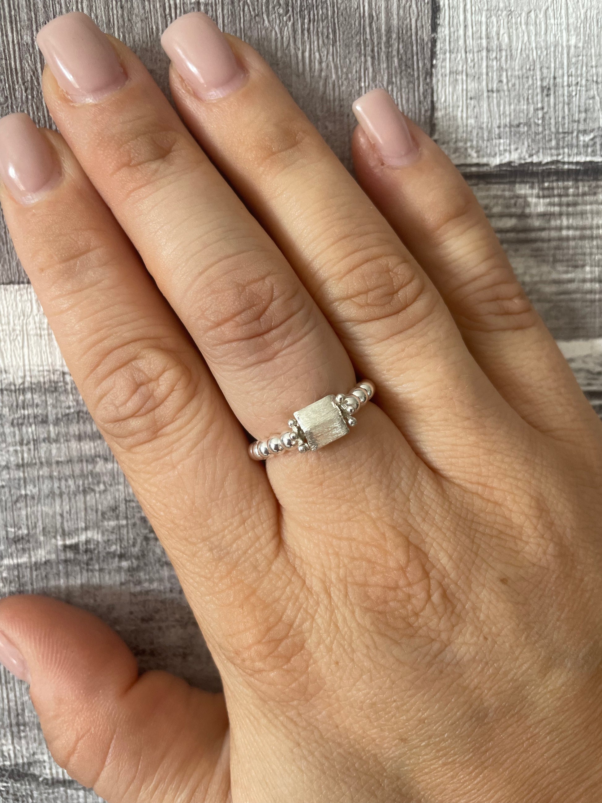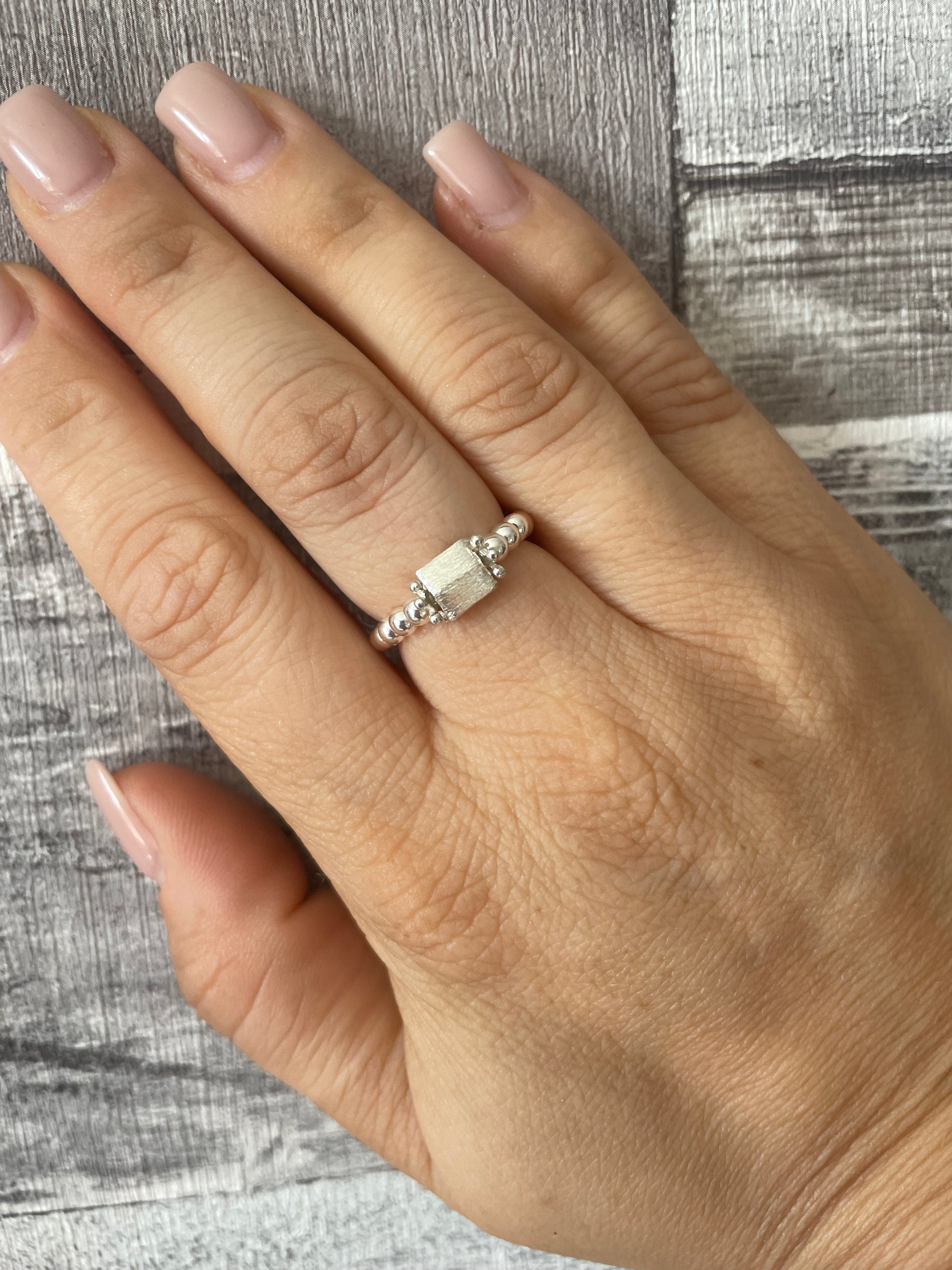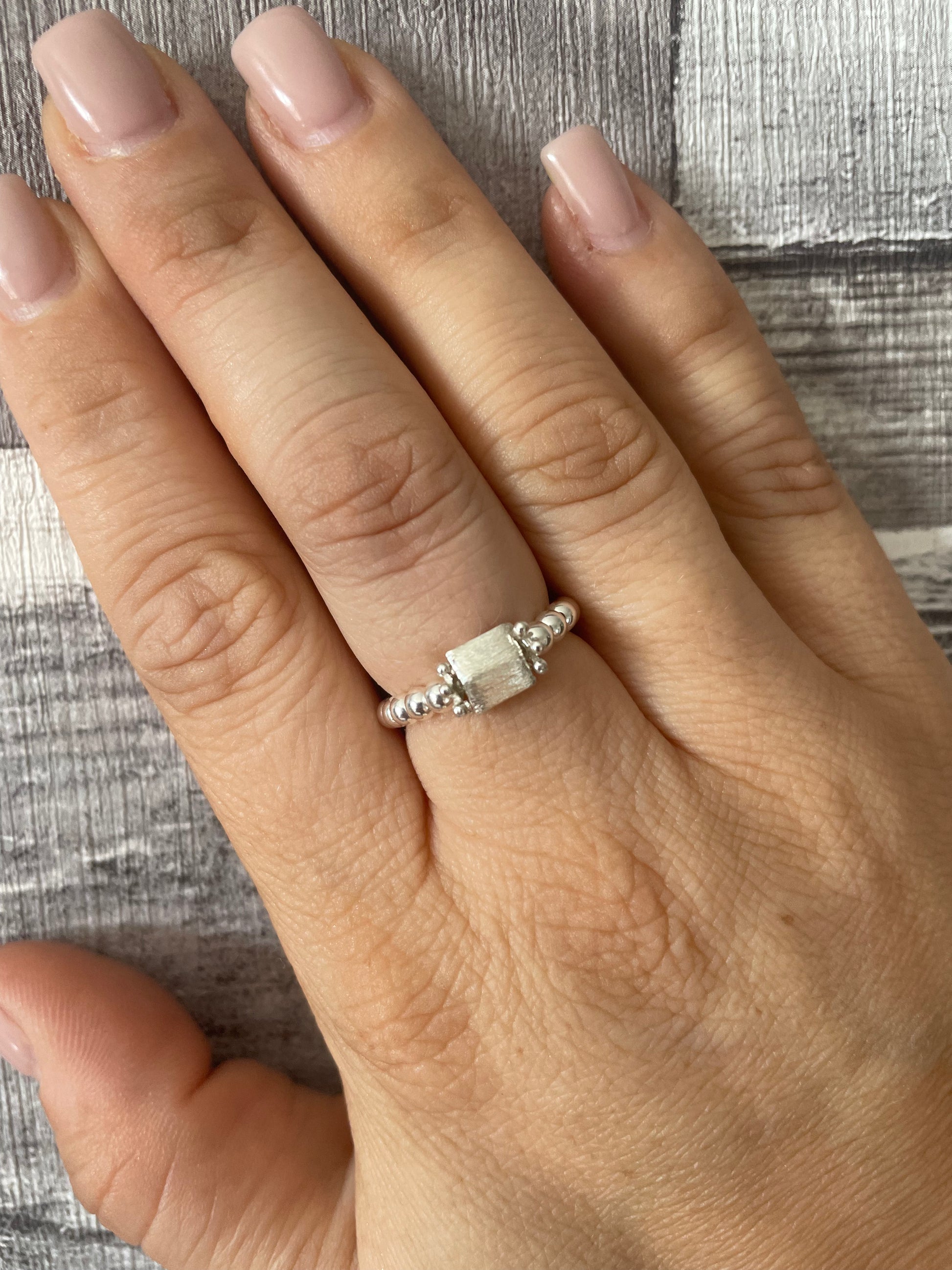 Our beautiful new designed brushed sterling silver square beaded ring is a simple but unique design that can be worn daily or to give a special outfit a little sparkle!